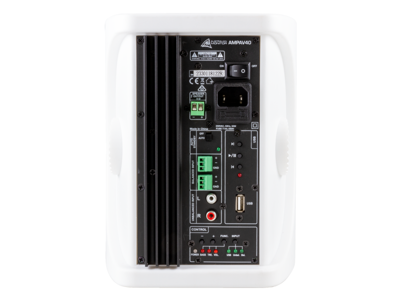The AMPAV40 features an unbalanced stereo input together with a full balanced stereo line input. An IR remote control is supplied to access all features including full USB/MP3 playback. The standby switch allows the system to engage the auto standby function. In auto mode, the speaker enters into standby (sleep) mode if no audio signal is detected for approximately 3 minutes. The speaker will then turn on automatically when it detects an audio signal.