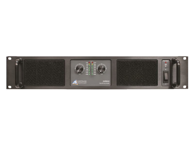 The AMB600 is a 2RU class AB stereo power amplifier delivering 600W into mono, stereo or bridged outputs. The AMB600 features individual front panel volume control, level meter, clip and protection indicators.