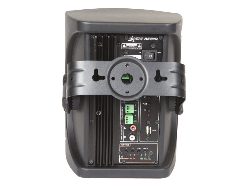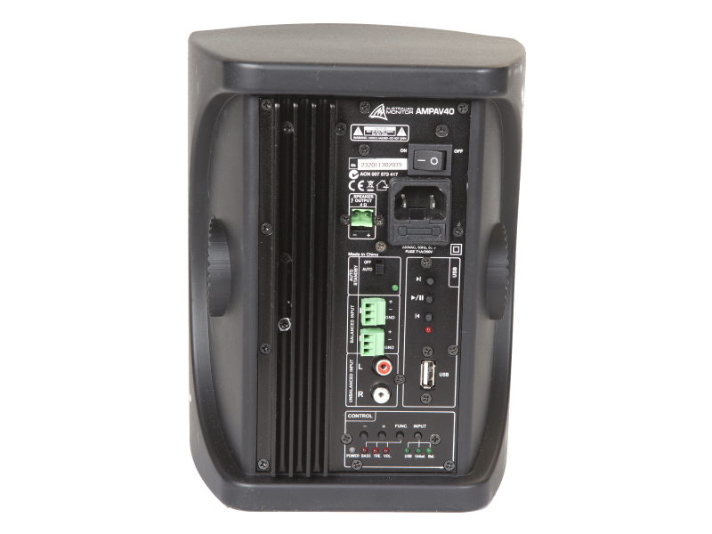 The AMPAV40 features an unbalanced stereo input together with a full balanced stereo line input. An IR remote control is supplied to access all features including full USB/MP3 playback. The standby switch allows the system to engage the auto standby function. In auto mode, the speaker enters into standby (sleep) mode if no audio signal is detected for approximately 3 minutes. The speaker will then turn on automatically when it detects an audio signal.