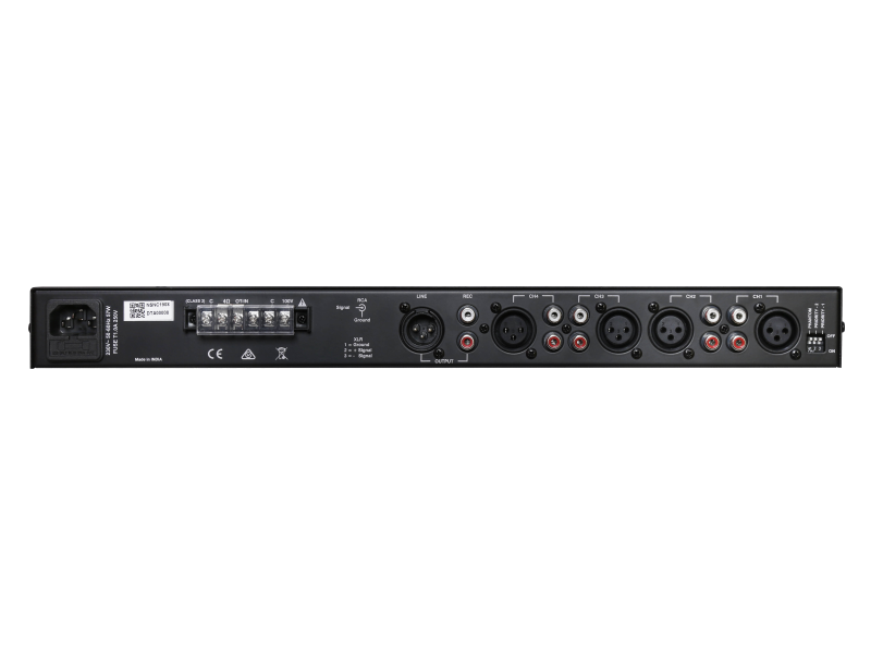 Output Power per Channel 60W Frequency Response 65Hz - 19.5kHz Output Mode 4 Ohm-100V THD+N < 0.2% Input Channels 4 MIC or Line Signal to Noise Ratio > 82dB Input Voltage 230Vac 50Hz Input Sensitivity MIC: 1.2mV - Line: 160mV Mounting 1RU Cooling Fan-assisted Warranty 5 years Product Dimensions