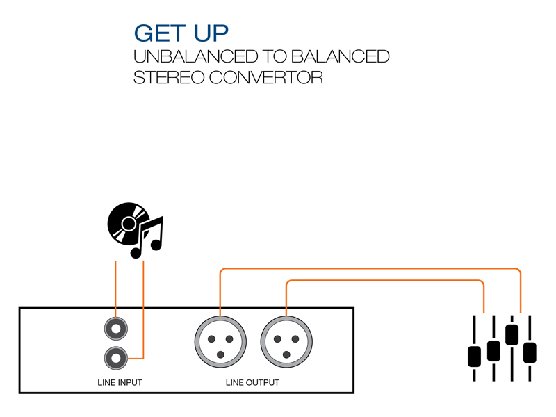 The GET UP stereo converter converts an unbalanced domestic level signal to a professional line level balanced audio signal.