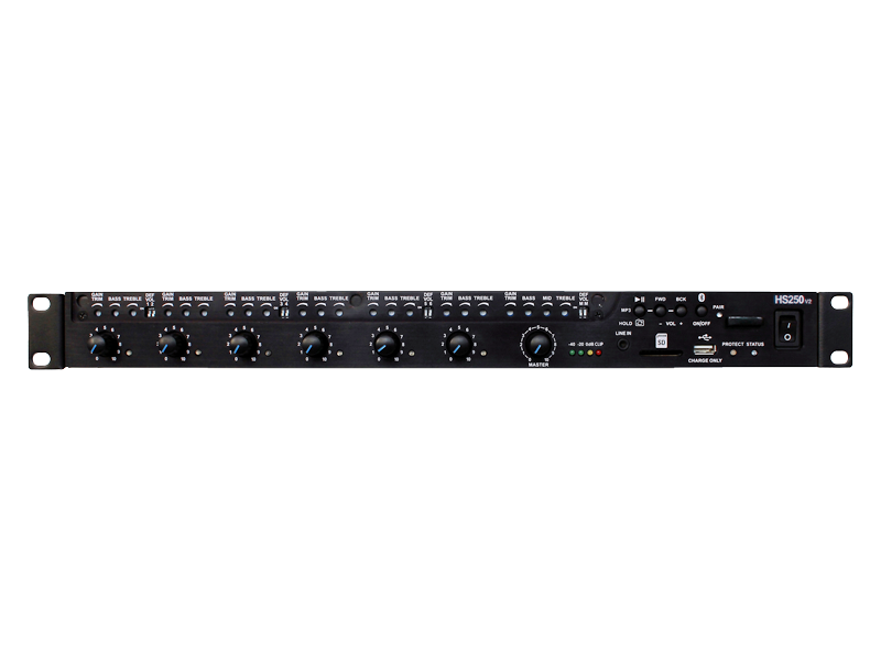 Output Power per Channel 250W Frequency Response 100Hz - 16kHz Output Mode 4 Ohm-70V-100V THD+N < 0.3% Input Channels 6 MIC or Line - Bluetooth - MP3 and Aux Signal to Noise Ratio > 75dB Input Voltage 100-240Vac 50-60Hz Input Sensitivity 0dBu Mounting 1RU Cooling Fan-assisted Warranty 5 years Product Dimensions