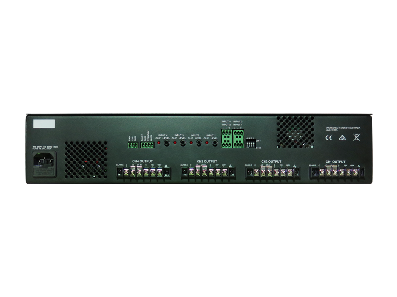Output Power per Channel 250W Frequency Response 100Hz - 16kHz Output Channels 4 THD+N < 0.25% (-3dB) Output Mode 4 Ohm-70V-100V Signal to Noise Ratio > 91dB Input Voltage 100-240Vac 50-60Hz Input Sensitivity 1Vrms Mounting 2RU Cooling Fan-assisted Warranty 5 years Product Dimensions