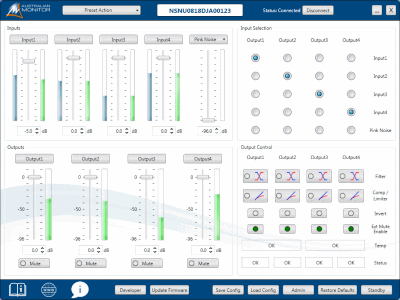 • Mini DSP - Volume controls, input / output routing, high and low pass filtering, compressor / limiter, pink noise / sine wave generator, muting and inversion