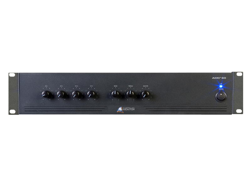 The Australian Monitor AMC+30 delivers high quality audio reinforcement in a low cost 2 rack unit package. The AMC+60 has 4 XLR microphone and dual RCA line inputs with input 1 having priority over inputs 2-4 (defeatable) and global 12VDC phantom power.