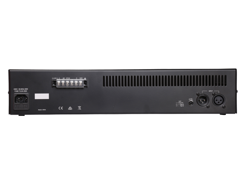 Output Power per Channel 120W Frequency Response 55Hz - 20kHz Output Channels 1 THD+N < 0.2% (-3dB) Output Mode 4 Ohm-100V Signal to Noise Ratio > 85dB Input Voltage 230Vac 50-60Hz Input Sensitivity 160mVrms Mounting 2RU Cooling Fan-assisted Warranty 5 years Product Dimensions