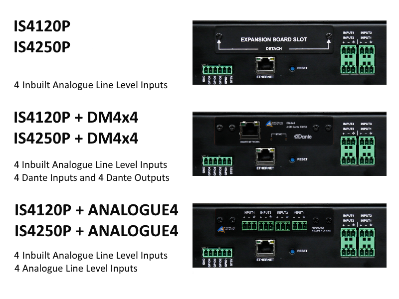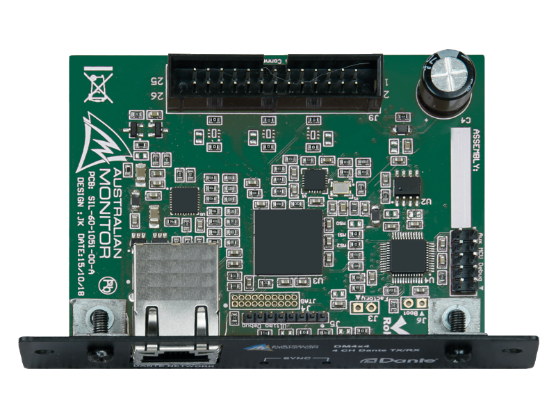 Provides 4 inputs channels from a Dante network which can be routed to any amplifier output channel. In addition, 4 Dante® outputs channels are available to route any analogue inputs back on to the network.