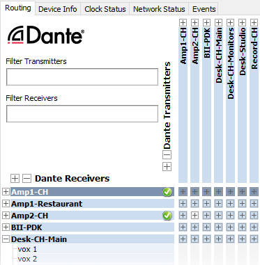 Using the controller software connect the ISP amplifier inputs and outputs to other available devices on the Dante® network.