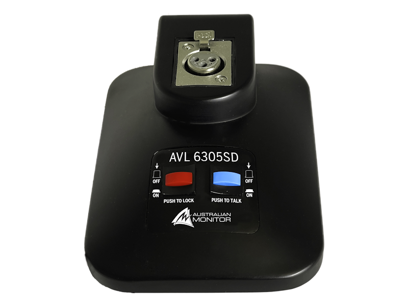 Desk microphone stand with built-in Push to Lock (PTL) and Push to Talk (PTT) switches.