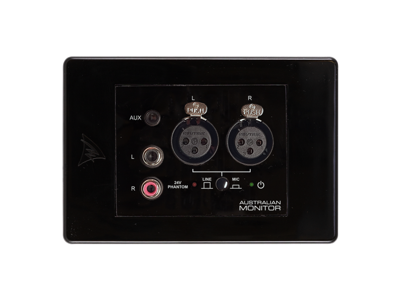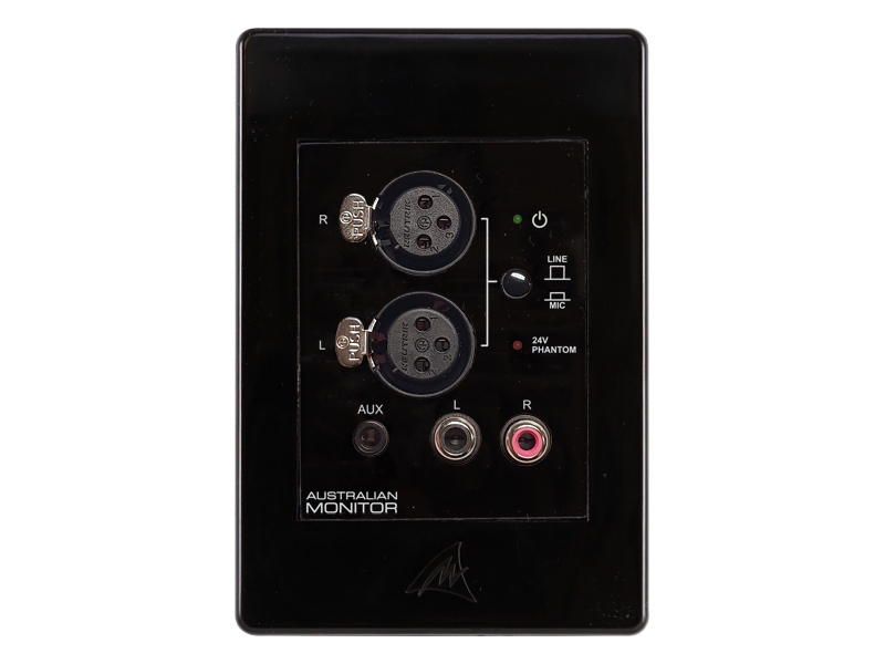 The WPML is an active audio input wall panel with XLR, RCA and 3.5mm input connector options. The XLR input can be selected to operate as either a microphone or line level input, the RCA and 3.5mm input are fixed to line level.