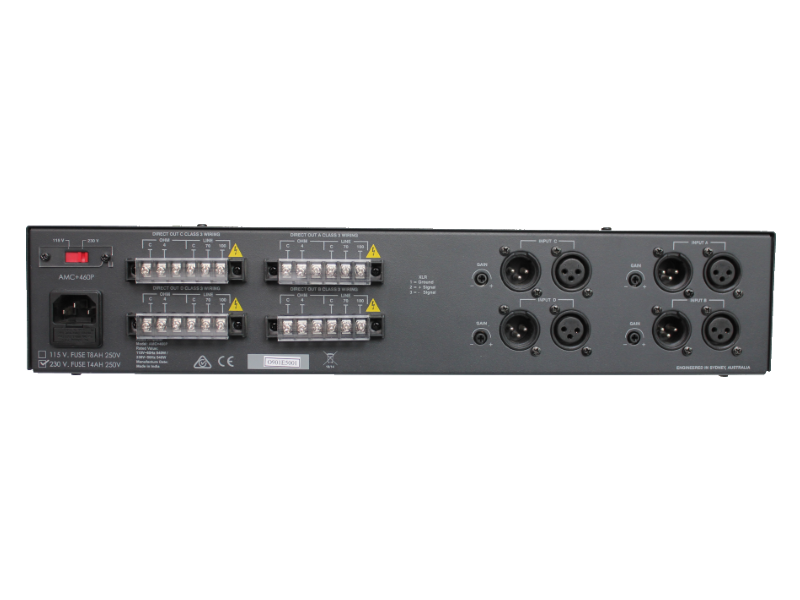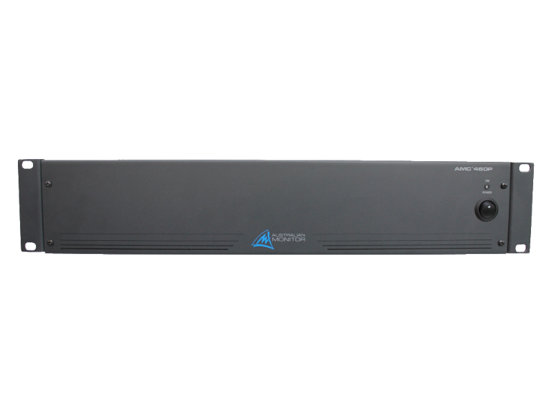 The AMC+460P power amplifier delivers 4 channels of 60 watts at 100 volt or 4 ohm in a 2 RU package.