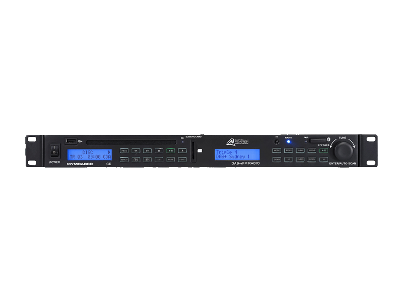 The MYMDABCD is a 1RU program source combining a programmable CD player, DAB+ / FM tuner and Bluetooth Module.