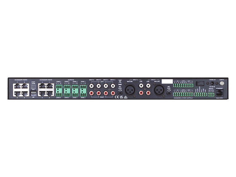 It features 2 Mic/Line and 4 line level stereo inputs which can be independently mixed to any output zone. An additional local audio input can also be added to each zone using audio wall panel inputs.