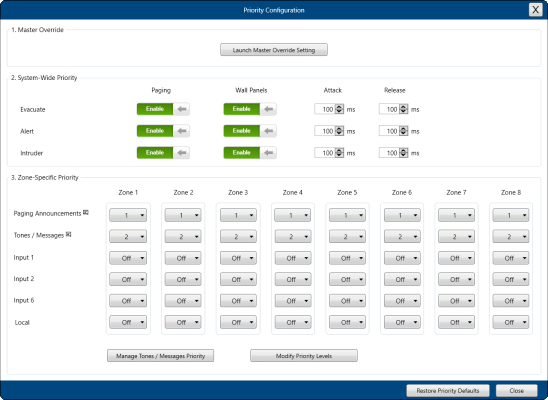 A master override is also included which can be triggered via an audio input or input contact closure.