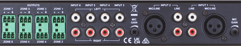 The ZONEMIX8 has 2 Mic/Line and 4 line level stereo inputs which can be independantly mixed to any of the 8 balanced mono outputs.